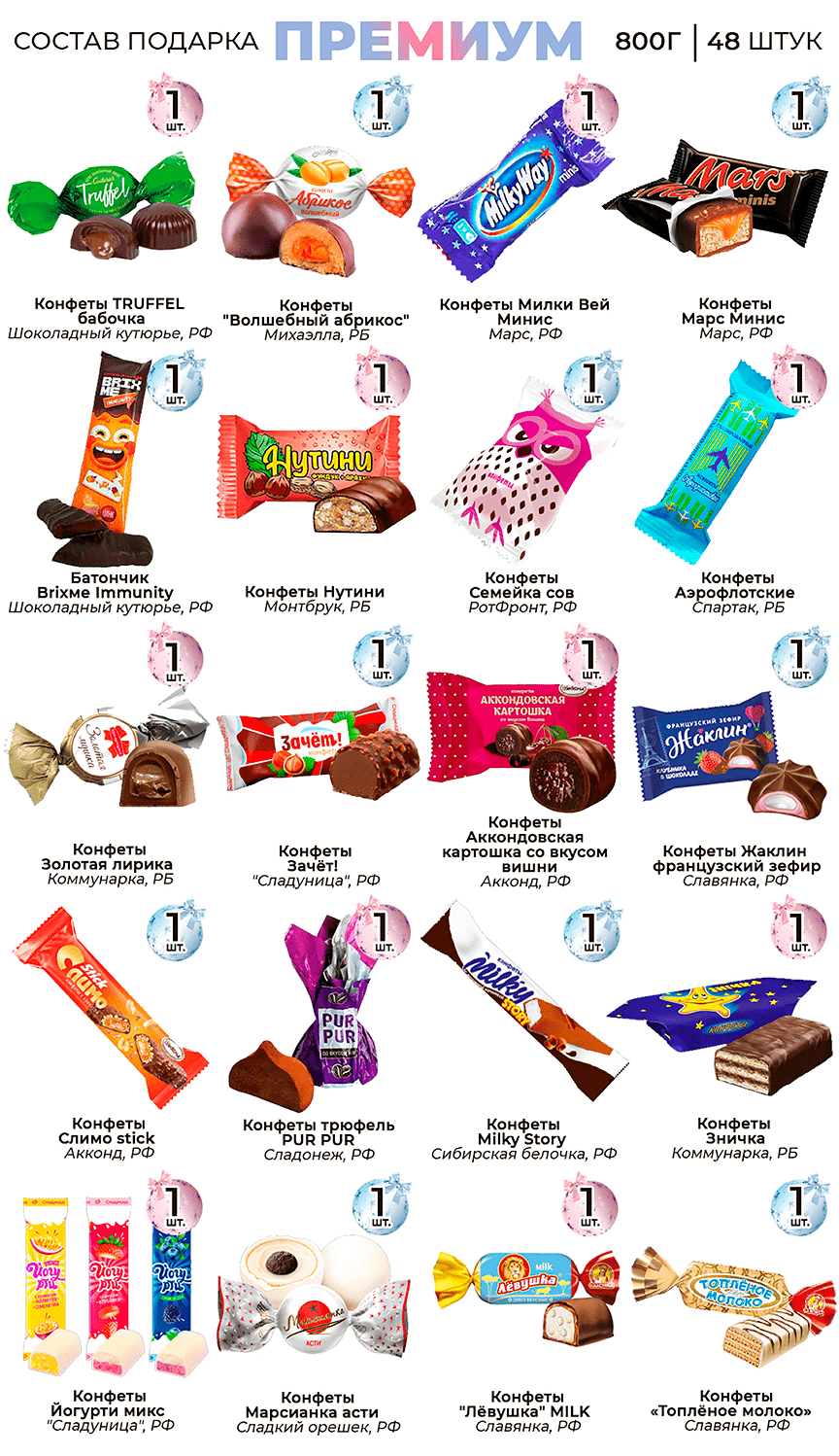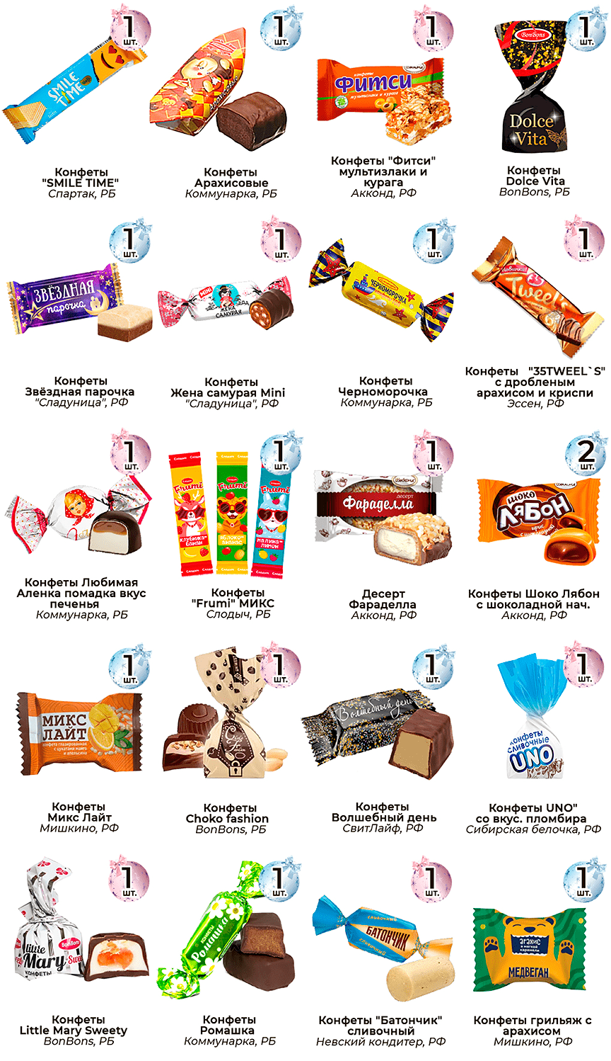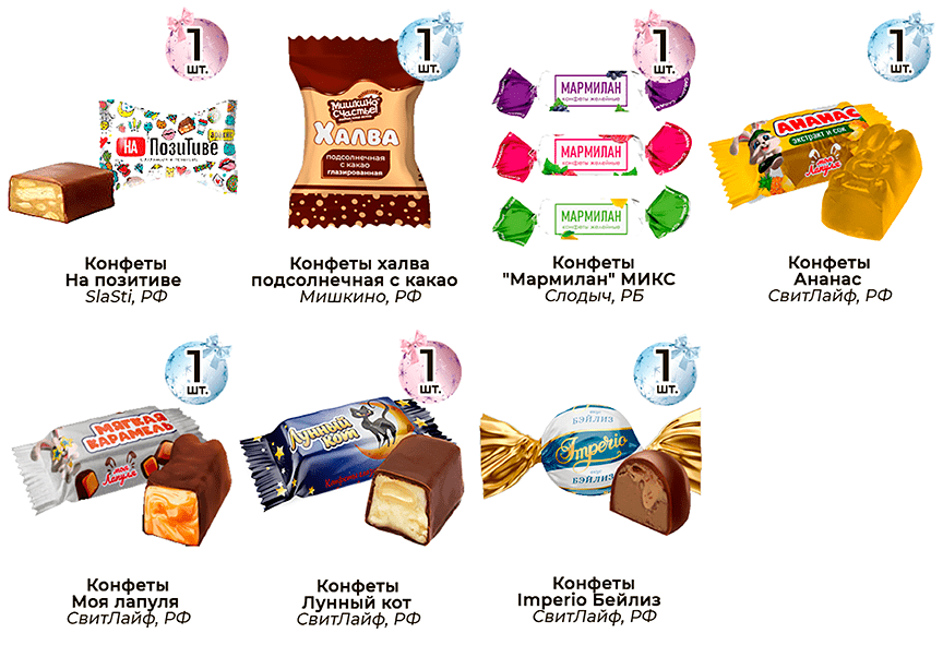 Только вкусные конфеты в подаркахВ подарки кладем только те сладости, которые заслужили признание и любовь покупателей.