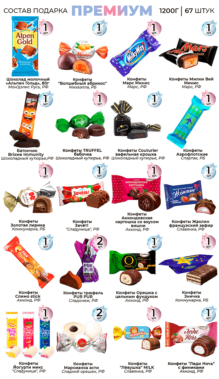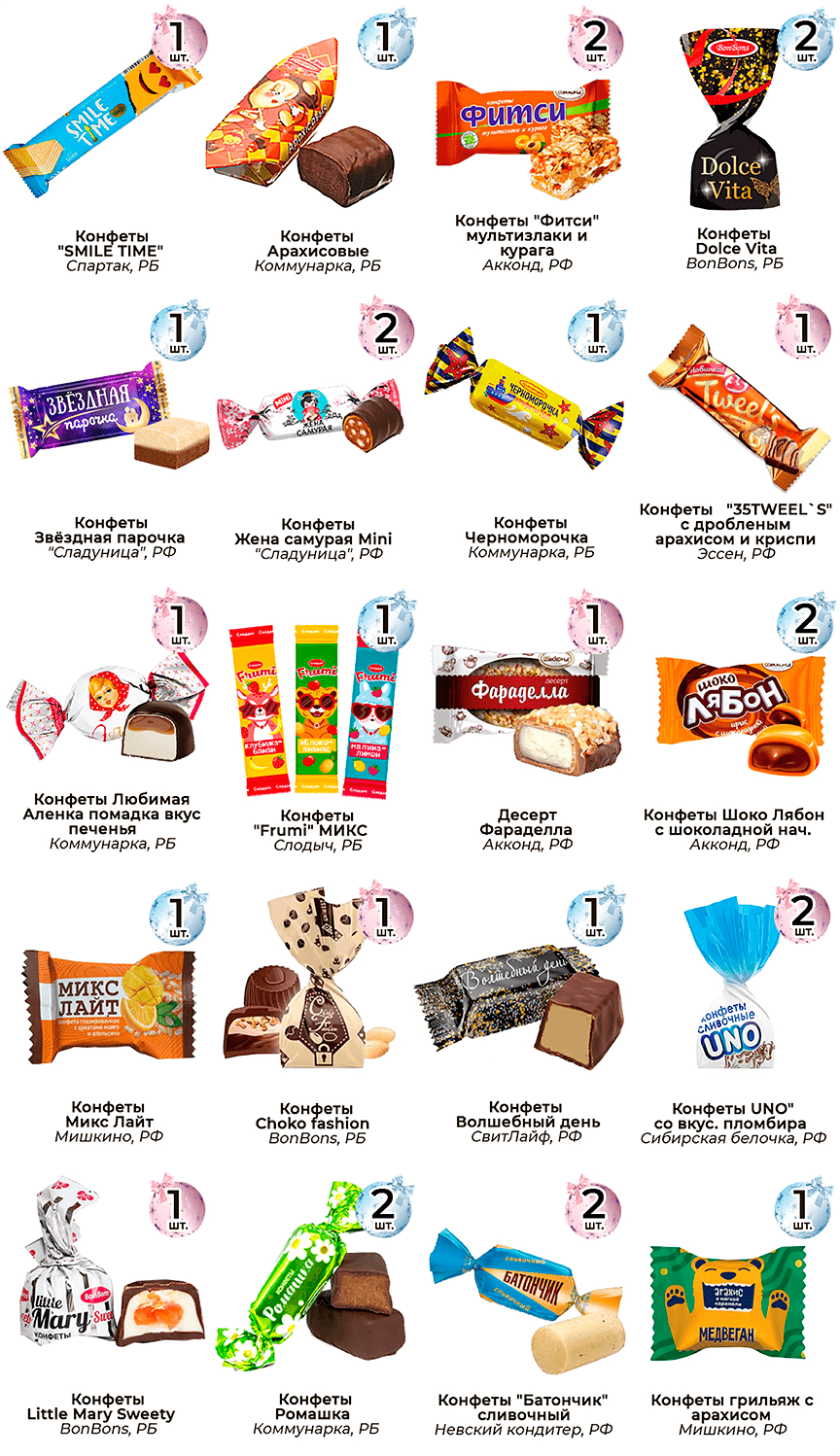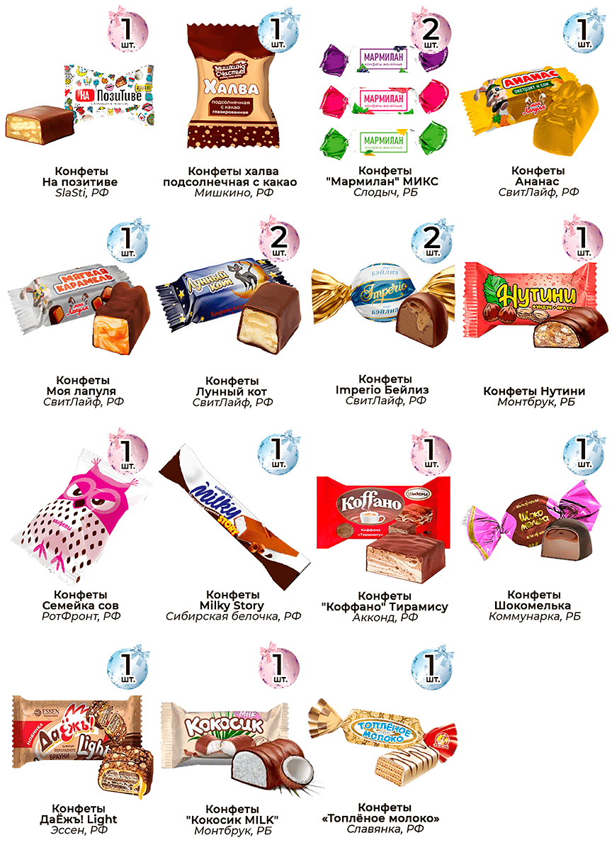 Только вкусные конфеты в подаркахВ подарки кладем только те сладости, которые заслужили признание и любовь покупателей.