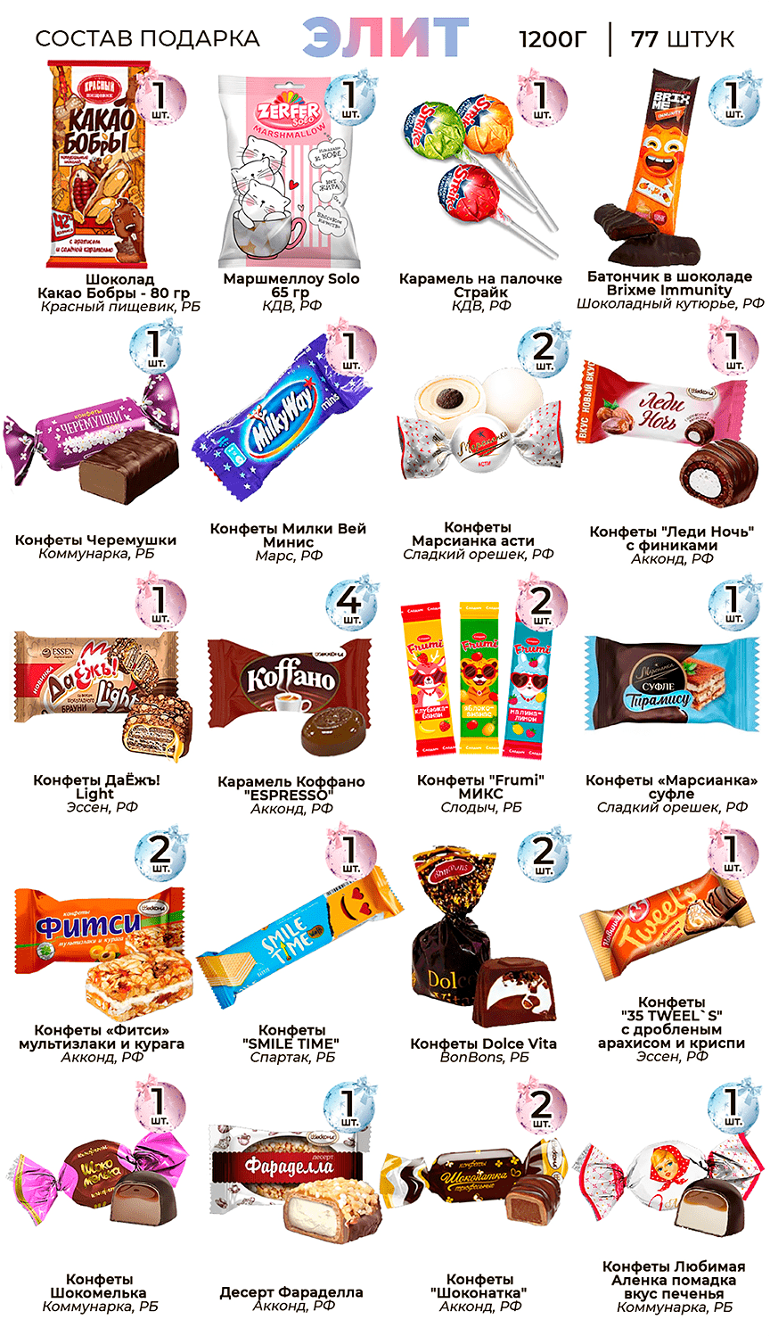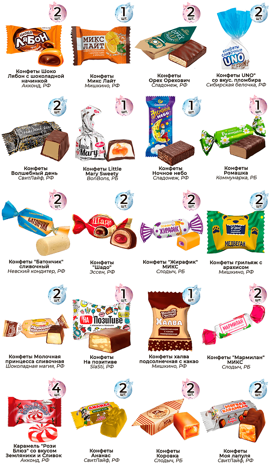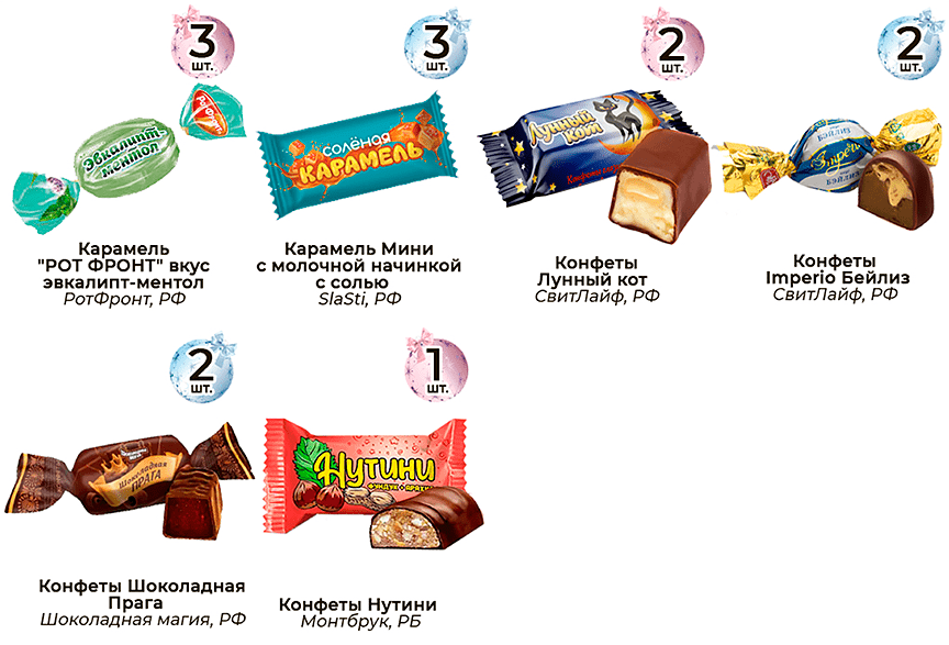 Только вкусные конфеты в подаркахВ подарки кладем только те сладости, которые заслужили признание и любовь покупателей.